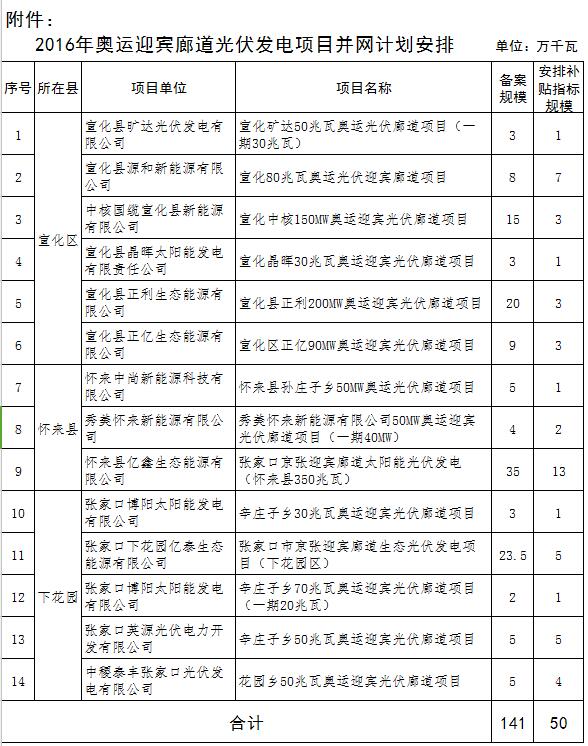 河北省2016年奧運(yùn)迎賓廊道光伏發(fā)電項(xiàng)目并網(wǎng)計(jì)劃安排情況公示 京張奧運(yùn)迎賓廊道光伏發(fā)電項(xiàng)目,規(guī)劃總規(guī)模155.5萬(wàn)千瓦,是2022年冬奧會(huì)重點(diǎn)工程之一。今年,國(guó)家先期下達(dá)并網(wǎng)計(jì)劃50萬(wàn)千瓦。根據(jù)《關(guān)于申報(bào)2016年奧運(yùn)迎賓廊道光伏發(fā)電項(xiàng)目的通知》(冀發(fā)改能源〔2016〕1038號(hào))要求,經(jīng)張家口市發(fā)改委申報(bào),并按照國(guó)家能源局要求,委托水電水利規(guī)劃設(shè)計(jì)總院依據(jù)企業(yè)編制的建設(shè)方案,圍繞技術(shù)先進(jìn)性標(biāo)準(zhǔn)、生態(tài)環(huán)保標(biāo)準(zhǔn)、景觀(guān)效果標(biāo)準(zhǔn)以及項(xiàng)目競(jìng)價(jià)情況,進(jìn)行綜合評(píng)價(jià)、排序的基礎(chǔ)上,經(jīng)研究并報(bào)國(guó)家能源局同意,現(xiàn)對(duì)2016年奧運(yùn)迎賓廊道光伏發(fā)電項(xiàng)目并網(wǎng)計(jì)劃安排有關(guān)情況,予以公示。 本次計(jì)劃安排所有項(xiàng)目均為已列入廊道規(guī)劃總規(guī)模,且已具備開(kāi)工建設(shè)條件的項(xiàng)目;按《河北省普通光伏電站項(xiàng)目競(jìng)爭(zhēng)性配置辦法》要求,經(jīng)項(xiàng)目業(yè)主申報(bào)、專(zhuān)家評(píng)審,本計(jì)劃所安排的項(xiàng)目上網(wǎng)電價(jià)按在項(xiàng)目投產(chǎn)時(shí)當(dāng)?shù)厣暇W(wǎng)標(biāo)桿電價(jià)基礎(chǔ)上降低0.03元/千瓦時(shí)執(zhí)行。 公示時(shí)間為2016年10月13日至10月17日。期間,如有異議,可如實(shí)向河北省能源局反映。 聯(lián)系電話(huà):0311—88600512 附件:2016年奧運(yùn)迎賓廊道光伏發(fā)電項(xiàng)目并網(wǎng)計(jì)劃安排 河北省能源局 2016年10月13日